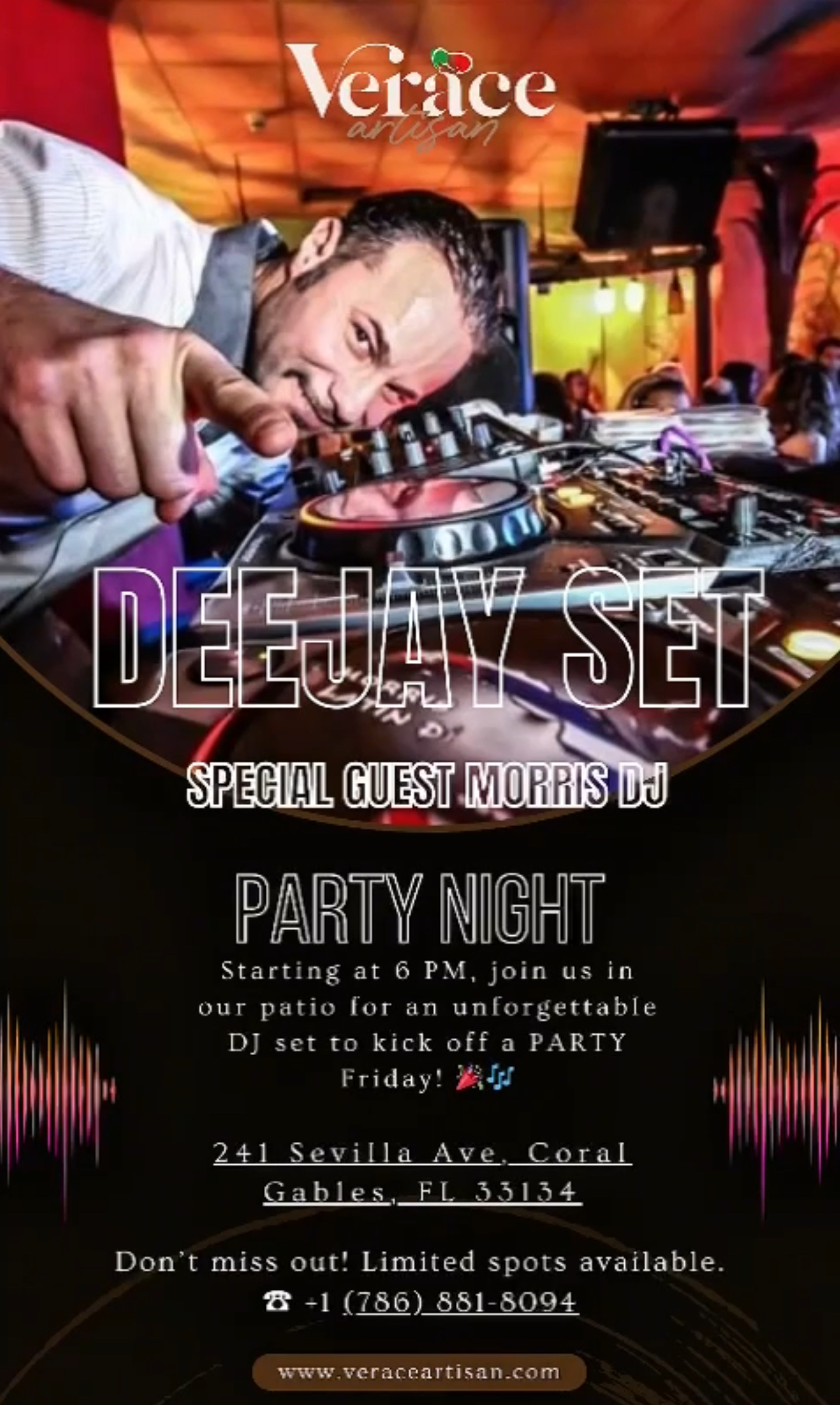 Mag 5 2025 PARTY NIGHT FRIDAY VERACE ITALIAN RESTAURANT All FRIDAY MIAMI OARRY NIGHT PARTY NIGHT (FREE PROSECCO) Starting at 6pm,join using our patio for an unforgettable DJ Set to kick off a PARTY FRIDAY 241 SEVILLA AVE, CORAL GABLES, FLORIDA 33124 Don’t miss out! Limited spots available. +1 (786) 881-8094